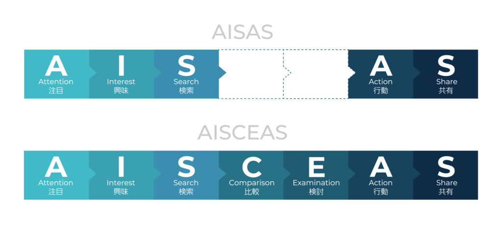 「AISAS(アイサス)の法則:Attention(注意)→ Interest(関心)→ Search(検索) → Action(行動)→ Share(共有)」や「AISCEAS(アイセアス)の法則:Comparison(比較)とExamination(検討)を加えたもの」なども言われています。